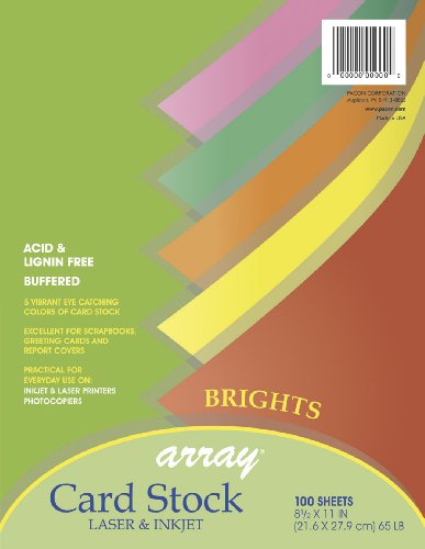 Heavyweight 65lb. Acid free cover. Perfect for greeting cards, postcards, report covers, rubber stamping, memory books, flyers, announcements and more. Lignin free, buffered. Available in film wrapped packages. Bright Assortment of colors, 8.5x11-Inch sheets, 100 sheets per package.Array Card Stock, 8.5 x 11 Inches, 100 Sheets (101175) Feature